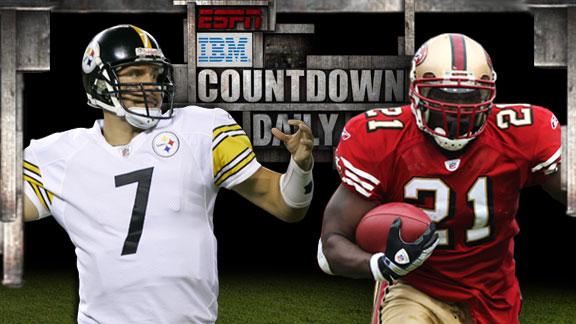 The Pittsburgh Steelers will travel west to take on the S.F. 49ers at Candlestick on Monday Night Football. A game brought to you Live by The Football Lounge. This match up features two very similar teams, both in their win loss record (both at 10-3) and in their play style. Both teams play stiffing defense, and like to pound the rock on offense. In this game of two eerily similar teams, I give the nod to S.F. due to their feature RB Frank Gore, and the fact that Big Ben is coming into this game very banged up. I get the feeling this could be one of those 3-3 games at halftime. Then again, it seems every time I 'expect' that, it ends up being a shootout. In the end, I look for S.F. to come out on top, in a very tough, hard fought game. Prediction: S.F. 24 Pitt 17